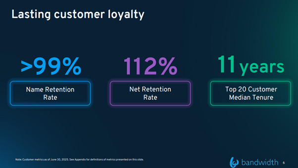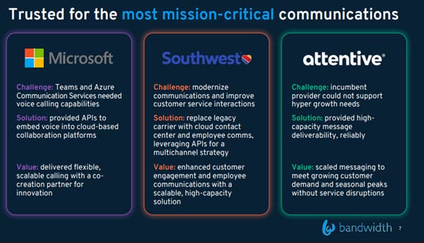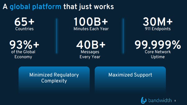 To illustrate, consider a healthcare company whose patient communications must comply with strict federal regulations and whose services cannot tolerate downtime. Or a global video conferencing platform that must terminate millions of calls into phone lines across dozens of countries. For such customers, the cheapest provider may not be the best. What matters is trust; trust that calls will connect, numbers will port correctly, emergency services will function without fail. By owning the network, Bandwidth can offer this trust directly, without relying on third parties.