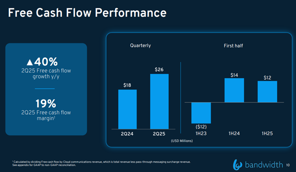 What stands out is that Bandwidth trades at a steep discount to peers despite being free cash flow positive and despite possessing structural advantages that others lack.