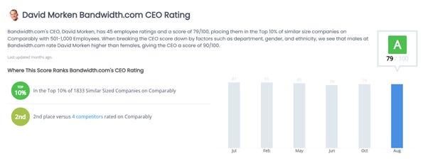 Employee sentiment mirrors this in raw, visible ways. With a CEO approval rating in the top 10% of comparable firms, Bandwidth also earns a 3.8 out of 5 on Glassdoor across hundreds of reviews.