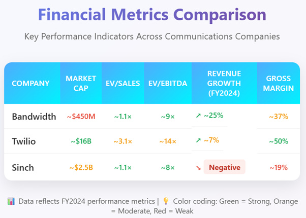 Financial statements are necessary, but they rarely suffice on their own. Behind each number reflects a decision on pricing, on capital structure, on investment priorities. Isolating the number without the context can lead to partial conclusions. For Bandwidth, comparisons show gross margins trailing peers, leverage above average, and growth that lacks smoothness. Interpreted narrowly, this suggests a firm unlikely to command a premium multiple. The more useful question is whether those accounting signals align with or diverge from the company’s underlying economics.