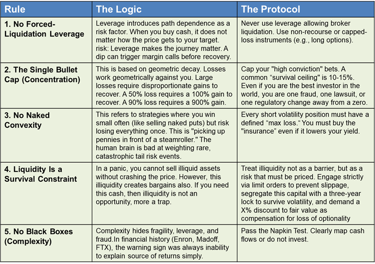 Strategies change and market regimes can rotate. But the logic of ruin and the biology of human stress are constant. By classifying rules this way, we prioritize them based on their lethality.