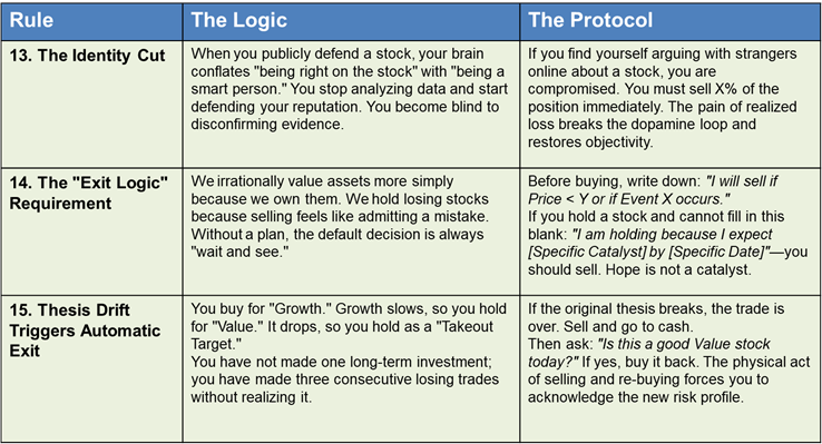 Any rule that you routinely ignore in sell‑offs or manias is not a real rule. For each one, either: