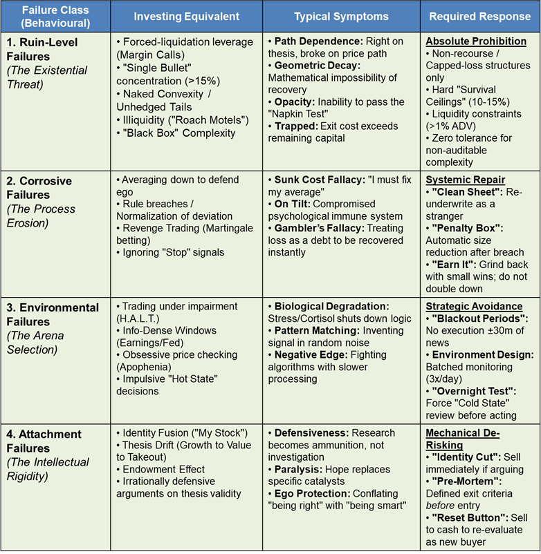 More than just mistakes, these are behaviours that convert ordinary market volatility into permanent insolvency. This encompasses excessive debt, naked risk-taking, and position sizes so large that a single loss ensures extinction.
