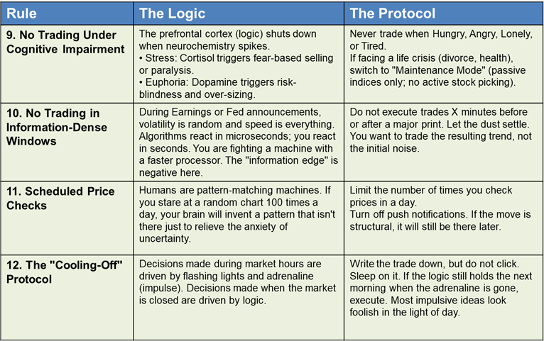 This is the biological reason for what later becomes Rule #9 (No Trading Under Cognitive Impairment). It is less about willpower than the recognition that your brain physically loses the capacity for complex choice under strain.