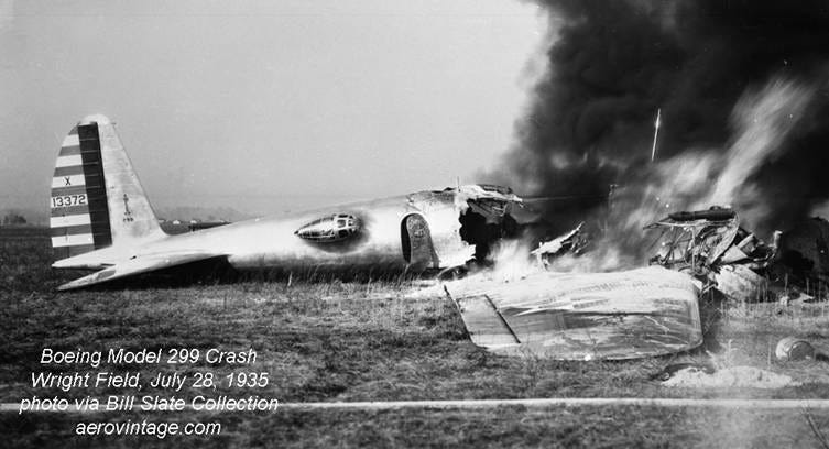Source: The Boeing 299 shortly after the crash at Wright Field on the morning of Wednesday, October 30, 1935.
