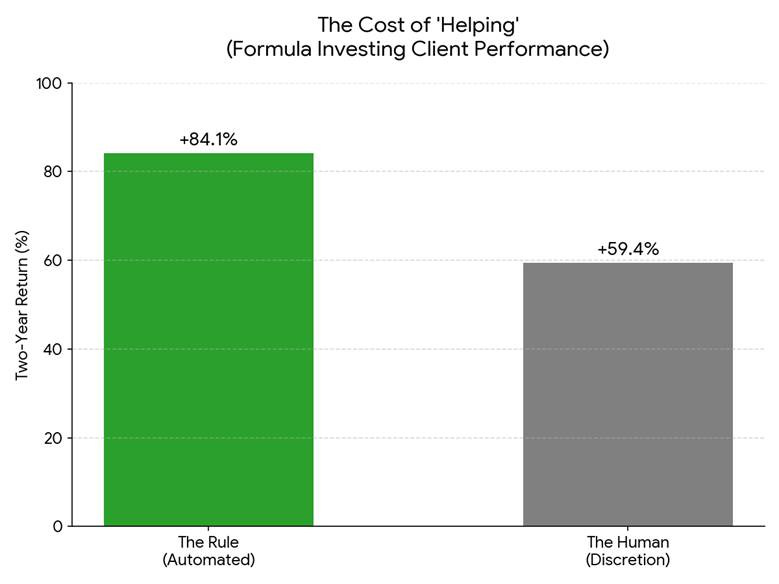 When clients were given the list of winning stocks but allowed to use their own judgment on when to buy or sell, they significantly underperformed the blind automation. They added insight and subtracted returns.